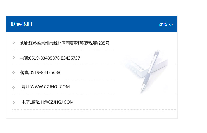 地址:常州市新北區友邦商務大廈1幢16、17層  電話:0519-85101652  傳真:0519-85112595  郵編:213022  網址:www.cz-jiayue_cn.hbyangyang.com  郵箱:xiajifengaa@163.com